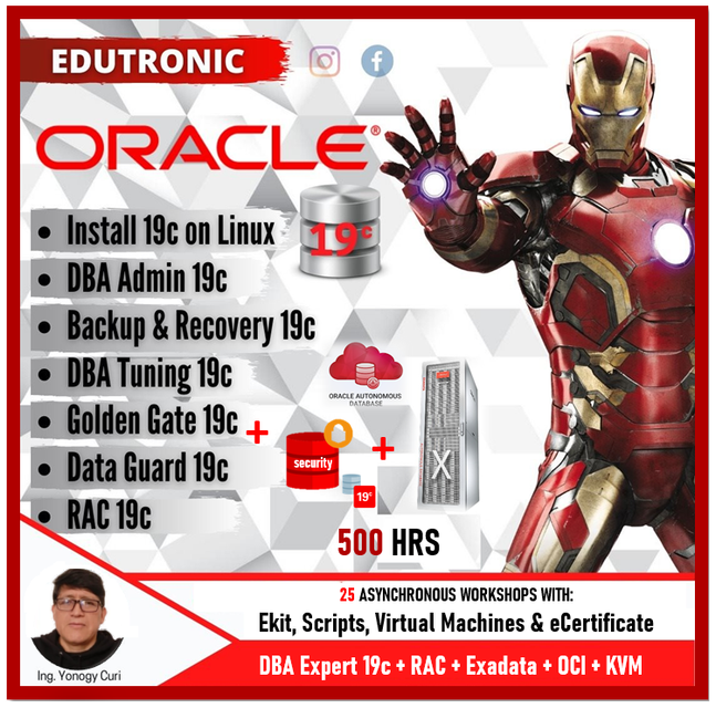 Conviértete en un Experto en Base de Datos Oracle con nuestros 25 Workshops: 👨🎓 Install 19c 👨🎓 Upgrade to 19c 👨🎓 DBA Admin 19c 👨🎓 Backup & Recover 19c 👨🎓 Data Guard 19c 👨🎓 Golden Gate 19c 👨🎓 DBA Tuning 19c 👨🎓 RAC 19c 👨🎓 DB Security 19c 👨🎓 Exadata Imp & Adm 👨🎓 Audit Vault Imp & Adm 👨🎓 DB Firewall Imp & Adm 👨🎓 23ai DBA New Features 👨🎓 Weblogic Imp & Adm 👨🎓 SOA Imp & Adm 👨🎓 ODI Imp & Adm 👨🎓 OBIEE Imp & Adm 👨🎓 KVM Implementation 👨🎓 KVM Administration 👨🎓 OCI Foundations 👨🎓 OCI DB Services 👨🎓 OCI DB Migration 👨🎓 OCI Autonomous DB 👨🎓 OCI Kubernetes 👨🎓 OCI Architect